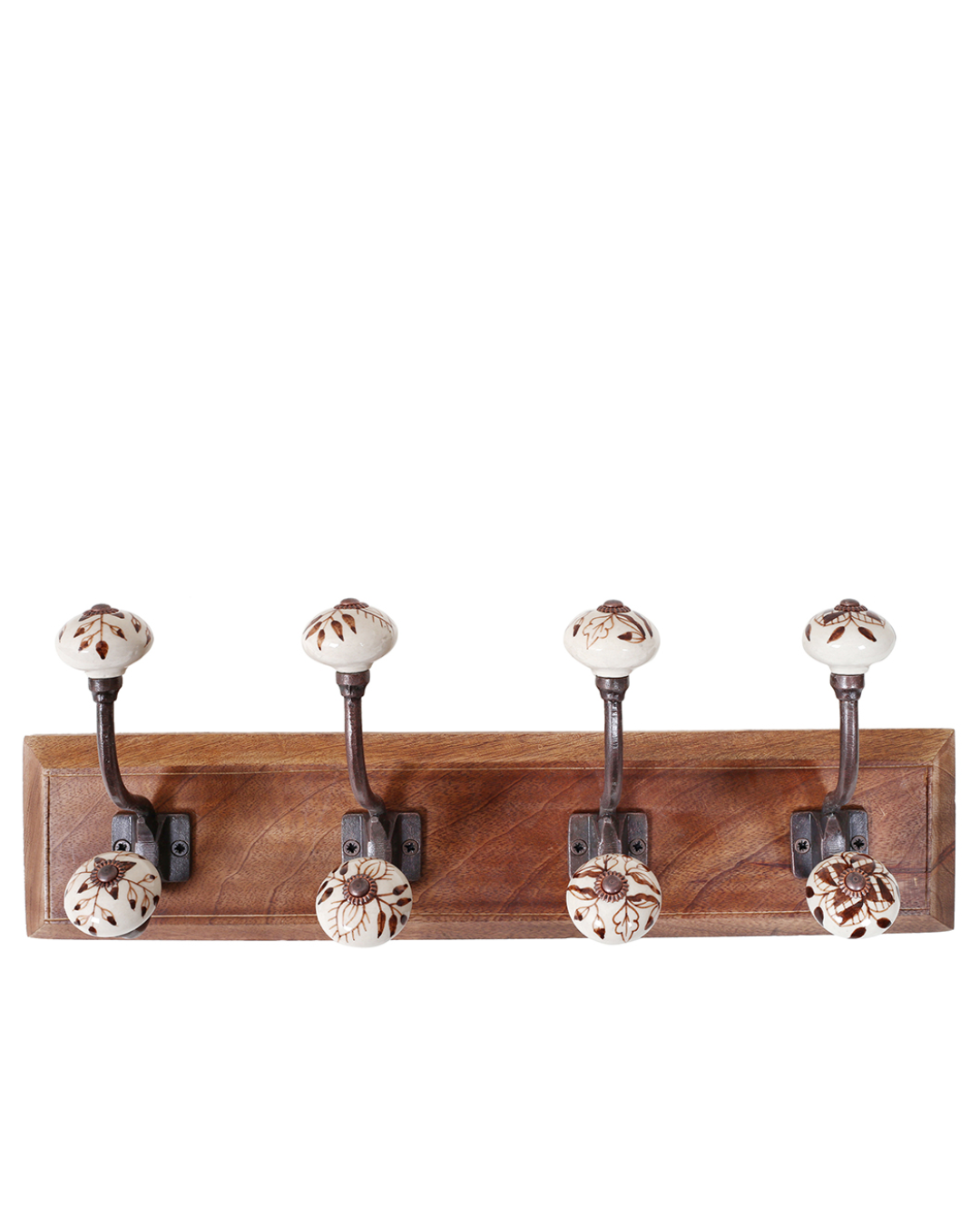 Perchero de madera con 4 pomos ceramicos artesanales.Cada pieza combina estructura robusta de hierro envejecido con diseños en tonos marrones aportando un aire rustico y artesanal.Medidas 45×11