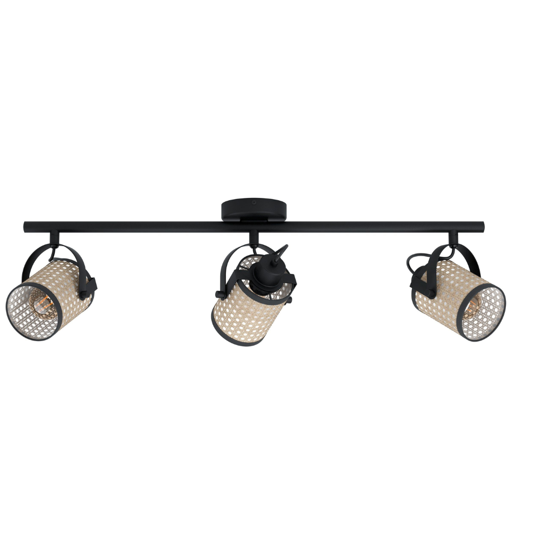 La lámpara de techo está realizada con tres cabezales cilíndricos móviles y una suspensión de metal negro. Las pantallas de una artística malla en colores naturales y papel transparente interno se combinan con sutiles elementos de metal negro y completan a la perfección el aspecto de la lámpara. Cuando está encendida, la malla crea un fascinante juego de luces y sombras. Gracias a los cabezales giratorios, el acogedor spot de techo es adecuado para cualquier estancia, ya sea en la cocina, el salón, el dormitorio, el pasillo o el comedor. Las bombillas de filamentos que se muestran no están incluidas. La lámpara es apta para cualquier bombilla con casquillo E27.