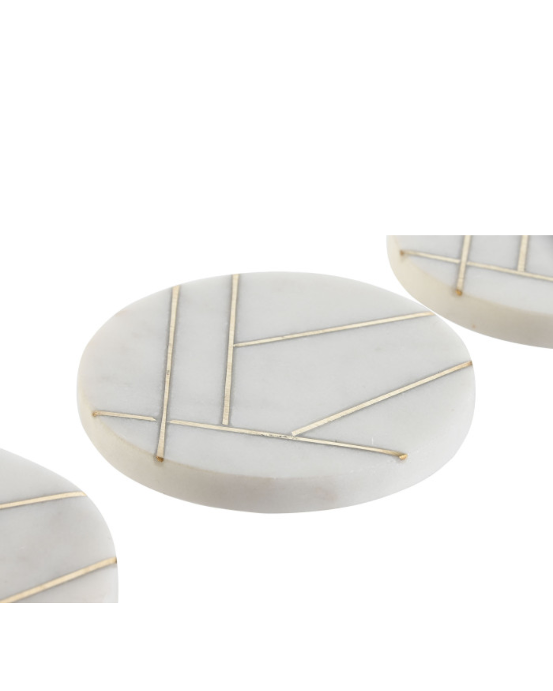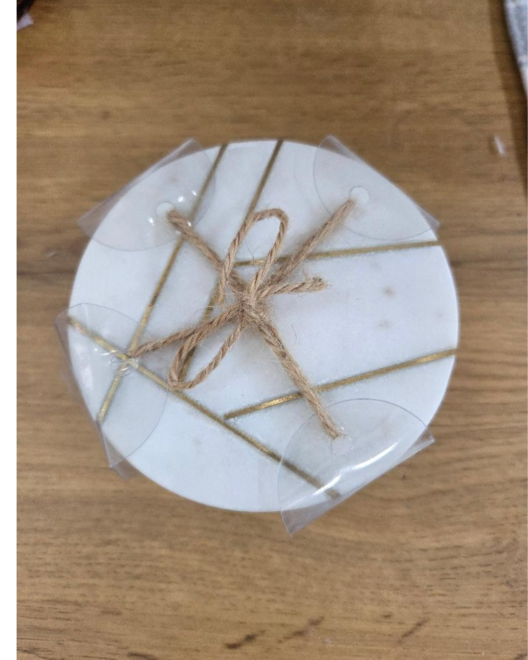 Posavasos de marmol blanco con dealle en dorado.Fabricado en autentico marmol blanco pulido decorado con delicadas lineas doradas.Perfecos para aportar estilo a tu mesa.