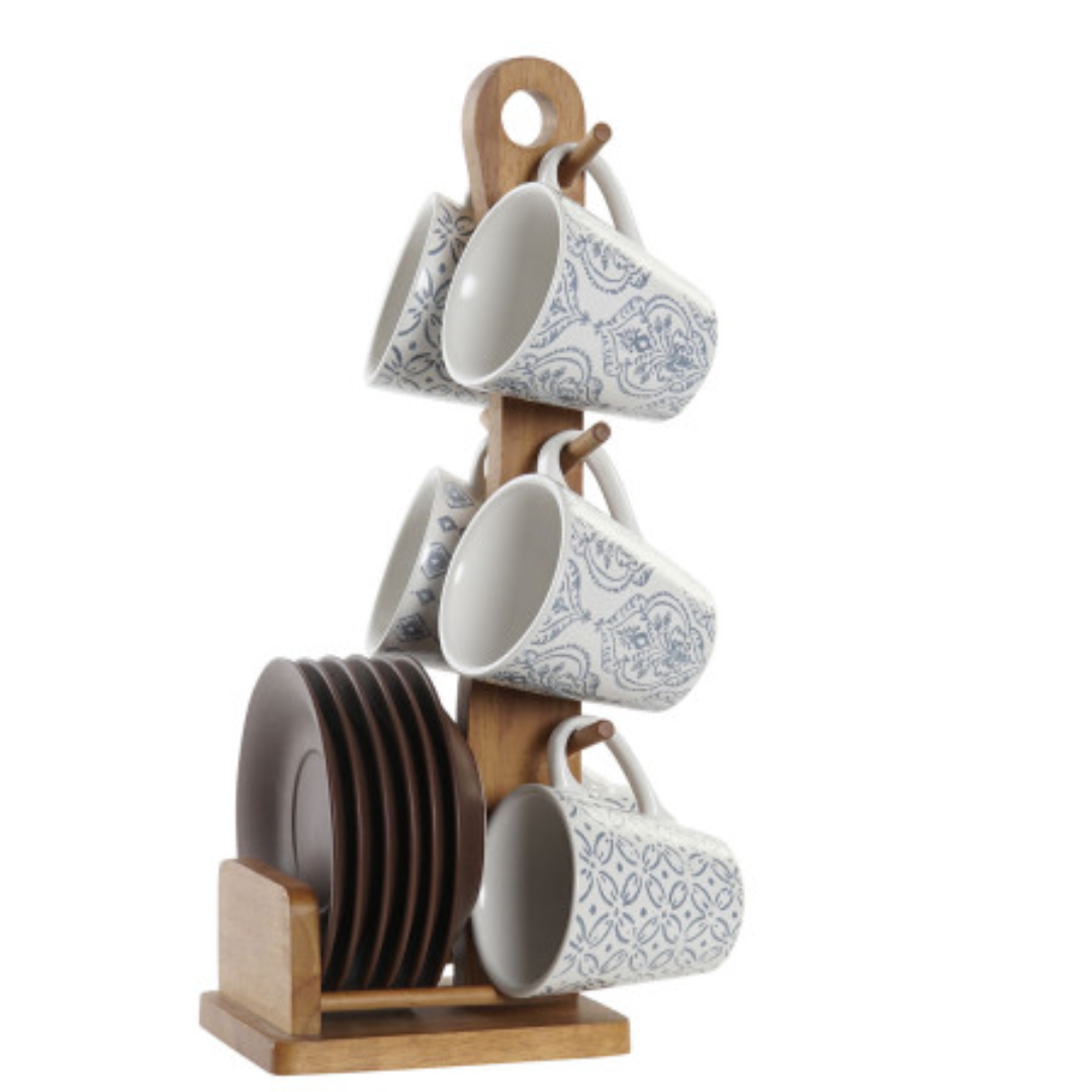 Este juego de cafe en toEnos azules,con estampado estilo azulejo y estilo vintage,es ideal para los que aman lo autentico y lo bonito.Las tazas cuelgan en su soporte de madera junto a sus platos a juego,creando una composicion calida y muy decorativa.